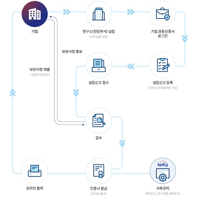기업부설연구소/연구개발전담부서 설립신고는 기본적으로 先설립·後신고체계이므로 이를 신고하고자 하는 기업은 신고 인정요건을 갖춘 상태에서 구비서류를 작성하여 (사)한국산업기술진흥협회에 신고