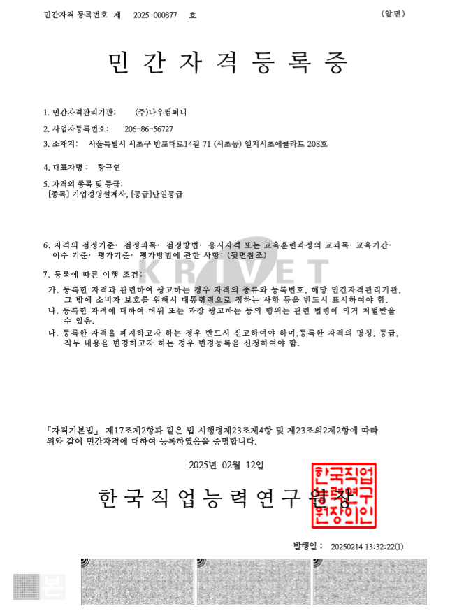 기업경영설계사는 관련 분야의 민간자격등록을 한 교육경영컨설팅 기관으로서 기업의 비즈니스 현장을 이끄는 전문가로 성장할 기회를 제공합니다.
