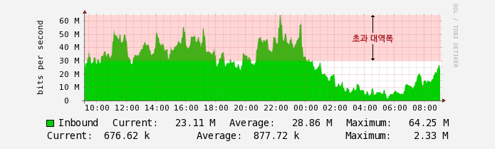 100kbps(bit rate)로 인코딩된 동영상 파일 30Mbps / 100kbps = 약 300명 (실제 30Mbsp 대역폭은 5분 단위로 계산되기 때문에 더 많은 유저가 접속할 수 있습니다) MRTG 페이지에서 계산되는 5분 동안의 전송된 트래픽량은 5분(300초) x 30Mbps = 9000Mbits가 됩니다. 이론적인 누적 트래픽으로 계산하면 다음과 같습니다. 30Mbps = 30M bit / Sec= 30x1024 Kbit / Sec=30720Kbit / Sec=30720/8 Kbyte 즉, Sec=3840Kbytes/Sec 즉 초당 3840Kbytes 전송하실 수 있습니다. 30M 대역폭의 하루 최대 트래픽은? 30Mbps : 약 305Gbyte |