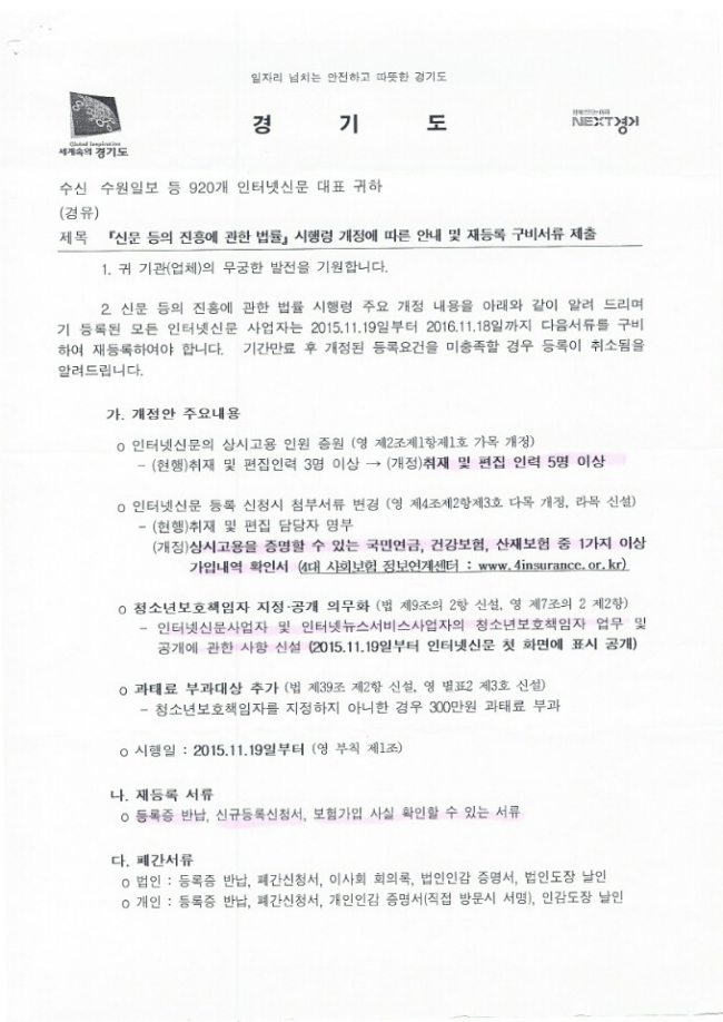 문화부 인터넷언론 등록강화 예고의 내용은 핵심은 등록기준 강화 취재·쳔집 인력을 기존 3명에서 5명으로 늘리고 인터넷신문 등록시 ‘취재 및 편집 담당자 명부’ 제출 대신 상시고용을 증명할 수 있는 국민연금, 건강보험 등에 대한 가입내역 확인서로 변경 했습니다.