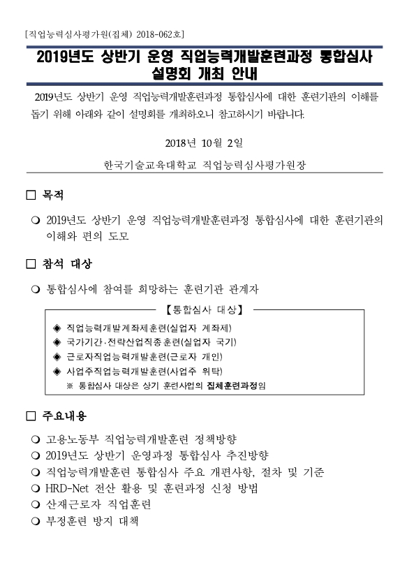 2019년도 상반기 운영 직업능력개발훈련과정 통합심사에 대한 훈련기관의 이해를 돕기 위해 아래와 같이 설명회를 개최하오니 참고하시기 바랍니다.