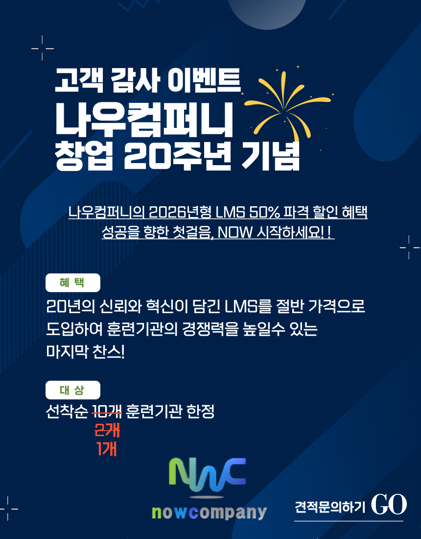 - 2026년 원격훈련 운영을 위한 체계적인 LMS 구축 고객사별 요구 반영한 추가개발 가능 오랜 업력을 통해 누적한 안정된 서버 임대 분야별 다양하고 방대한 콘텐츠 제공