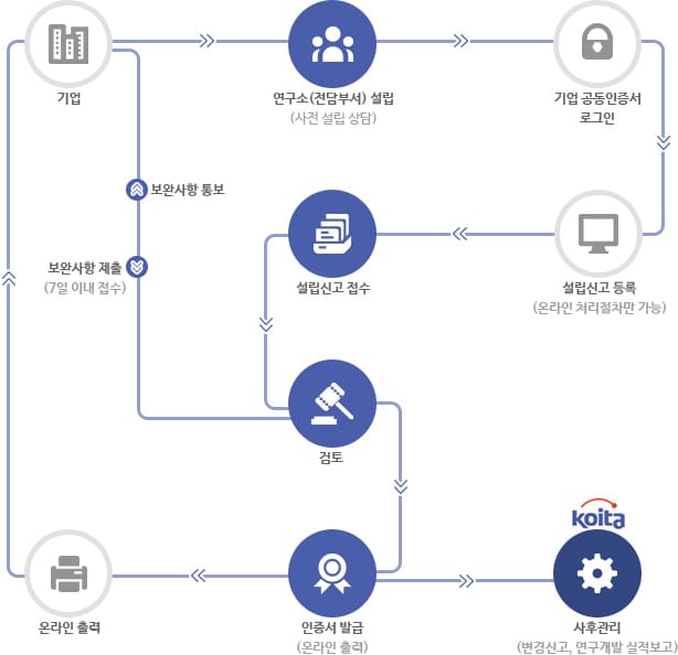 기업부설연구소/연구개발전담부서 설립신고는 기본적으로 先설립·後신고 체계이므로 이를 신고하고자 하는 기업은 신고 인정요건을 갖춘 상태에서 구비서류를 작성하여 (사)한국산업기술진흥협회에 신고