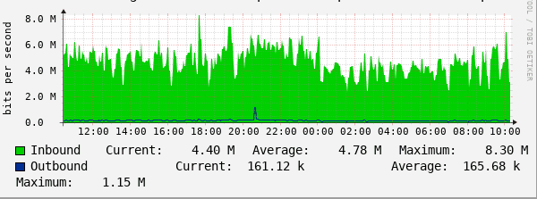 100kbps(bit rate)로 인코딩된 동영상 파일 30Mbps / 100kbps = 약 300명 (실제 30Mbsp 대역폭은 5분 단위로 계산되기 때문에 더 많은 유저가 접속할 수 있습니다) MRTG 페이지에서 계산되는 5분 동안의 전송된 트래픽량은 5분(300초) x 30Mbps = 9000Mbits가 됩니다. 이론적인 누적 트래픽으로 계산하면 다음과 같습니다. 30Mbps = 30M bit / Sec= 30x1024 Kbit / Sec=30720Kbit / Sec=30720/8 Kbyte 즉, Sec=3840Kbytes/Sec 즉 초당 3840Kbytes 전송하실 수 있습니다. 30M 대역폭의 하루 최대 트래픽은? 30Mbps : 약 305Gbyte |