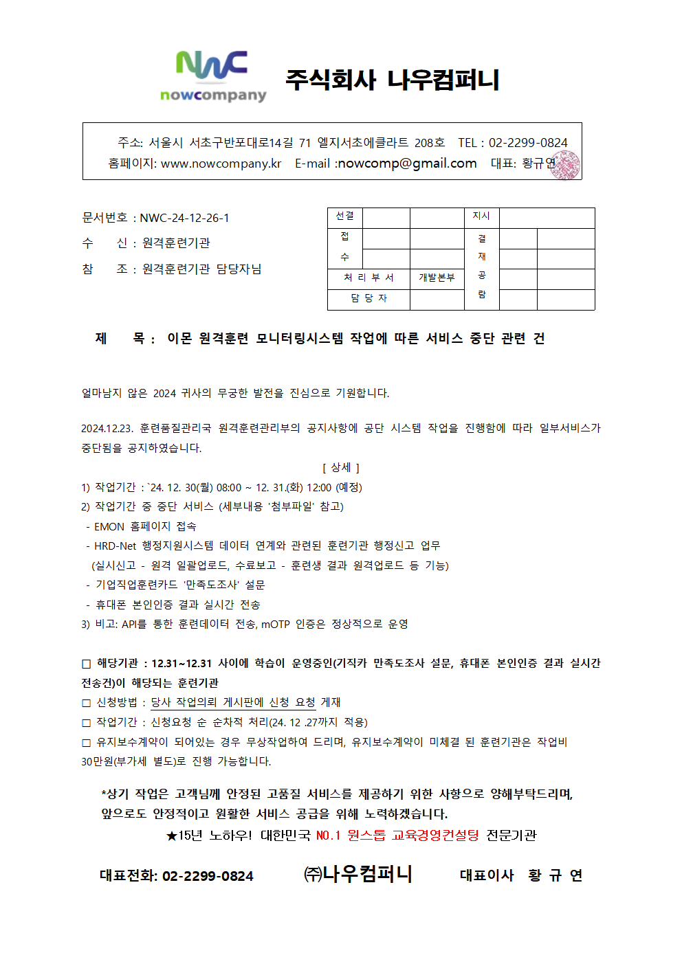이몬 원격훈련 모니터링시스템 작업에 따른 서비스 중단 관련 건