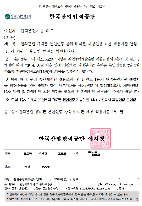원격훈련 휴대폰 본인인증 강화에 따른 과정인정요건 적용기준 알림
